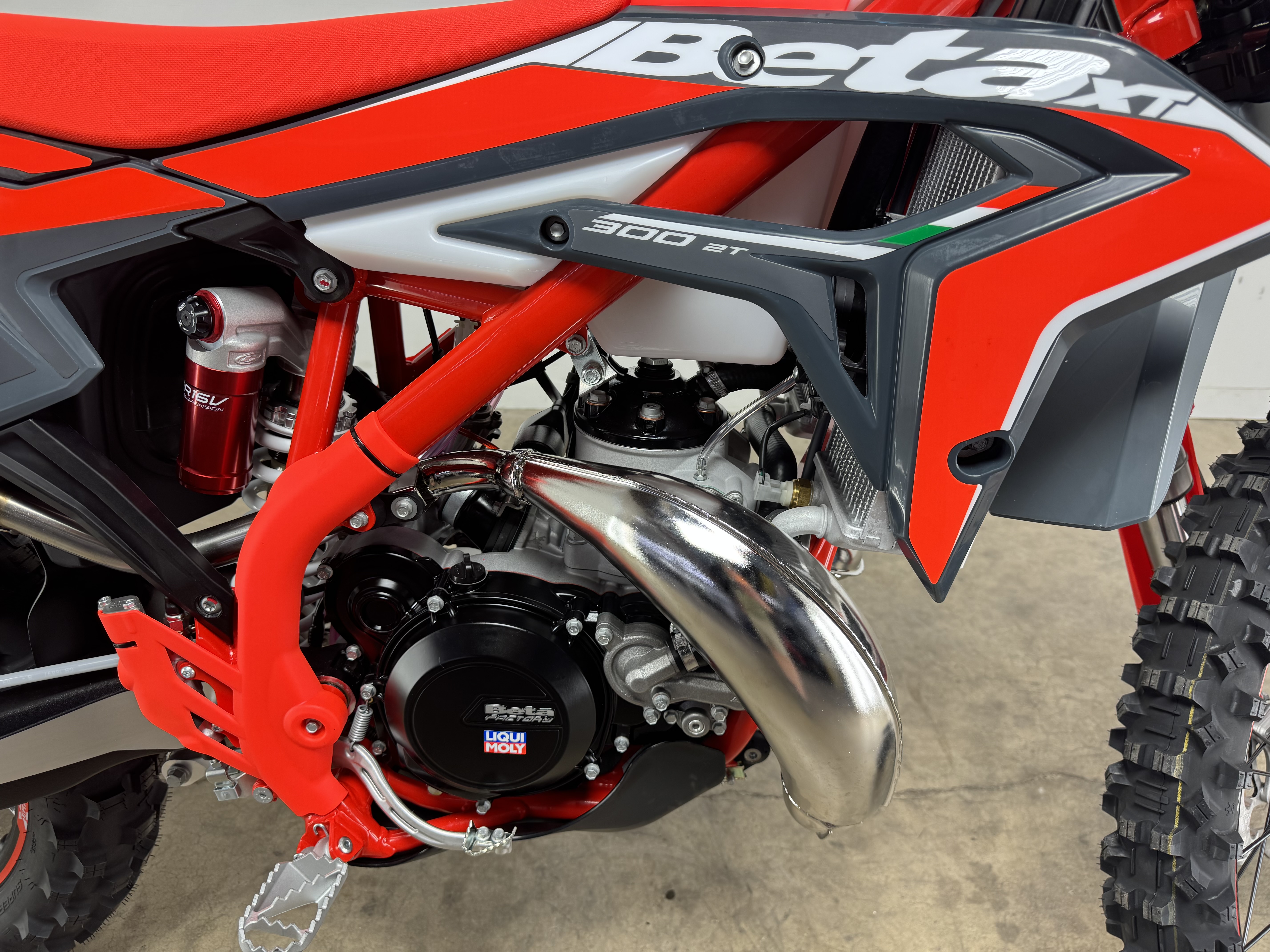 Beta Built single cylinder, 2-stroke, liquid cooled, with BPV power valve system and counter balancer, electric start with back-up kick starter sold as an option